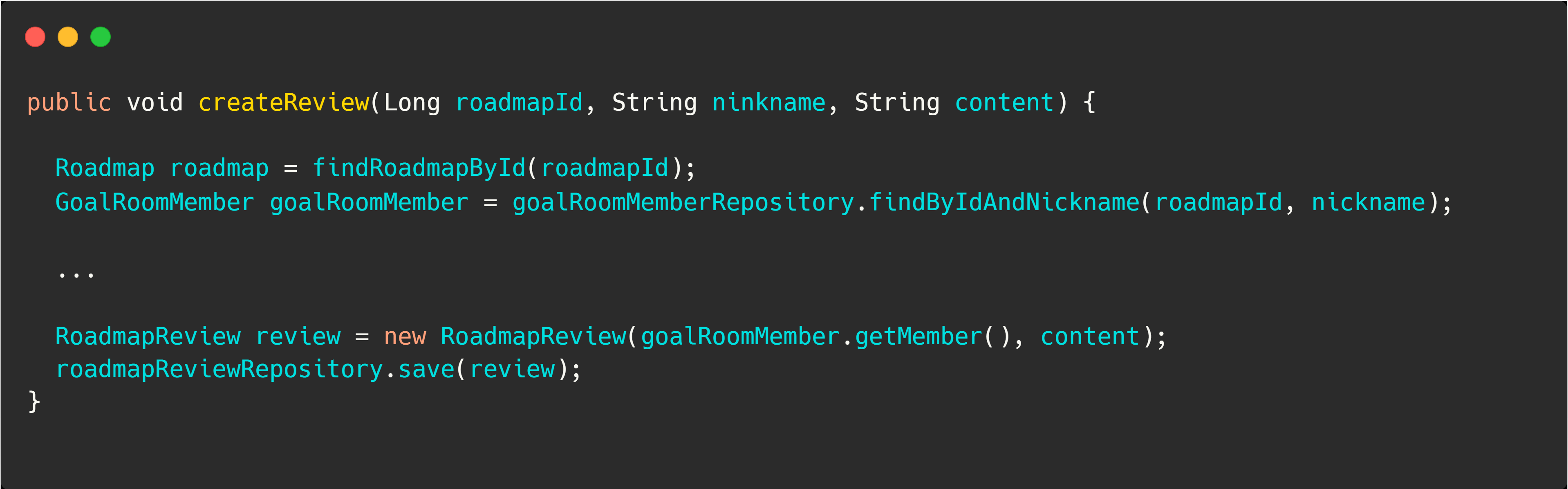 GoalRoom 패키지에 존재하는 클래스인 GoalRoomMember를 Roadmap에서 직접 호출하지 않도록 리팩터링했다. 인터페이스인 RoadmapGoalRoomService는 Roadmap 패키지에 두고 그 구현체를 GoalRoomMember를 실제로 가지고 있는 GoalRoom 패키지에서 구현해서 의존성을 역전시켜주었다.