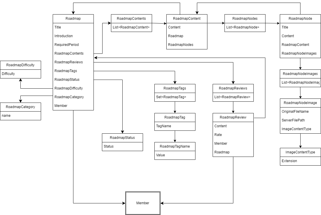 살펴보면 Roadmap과 RoadmapContent, RoadmapReview 사이에 의존성 사이클이 있는 것을 볼 수 있다. 처음 팀원들과 엔티티를 설계할 때는 연관관계를 가질 필요가 없다면 가지지 않는 것을 기준으로 했기에 생각보다 많지는 않았다. 양방향 연관관계인 경우에는 연관관계 편의 메서드를 잘 작성하는 식으로 개발했다.