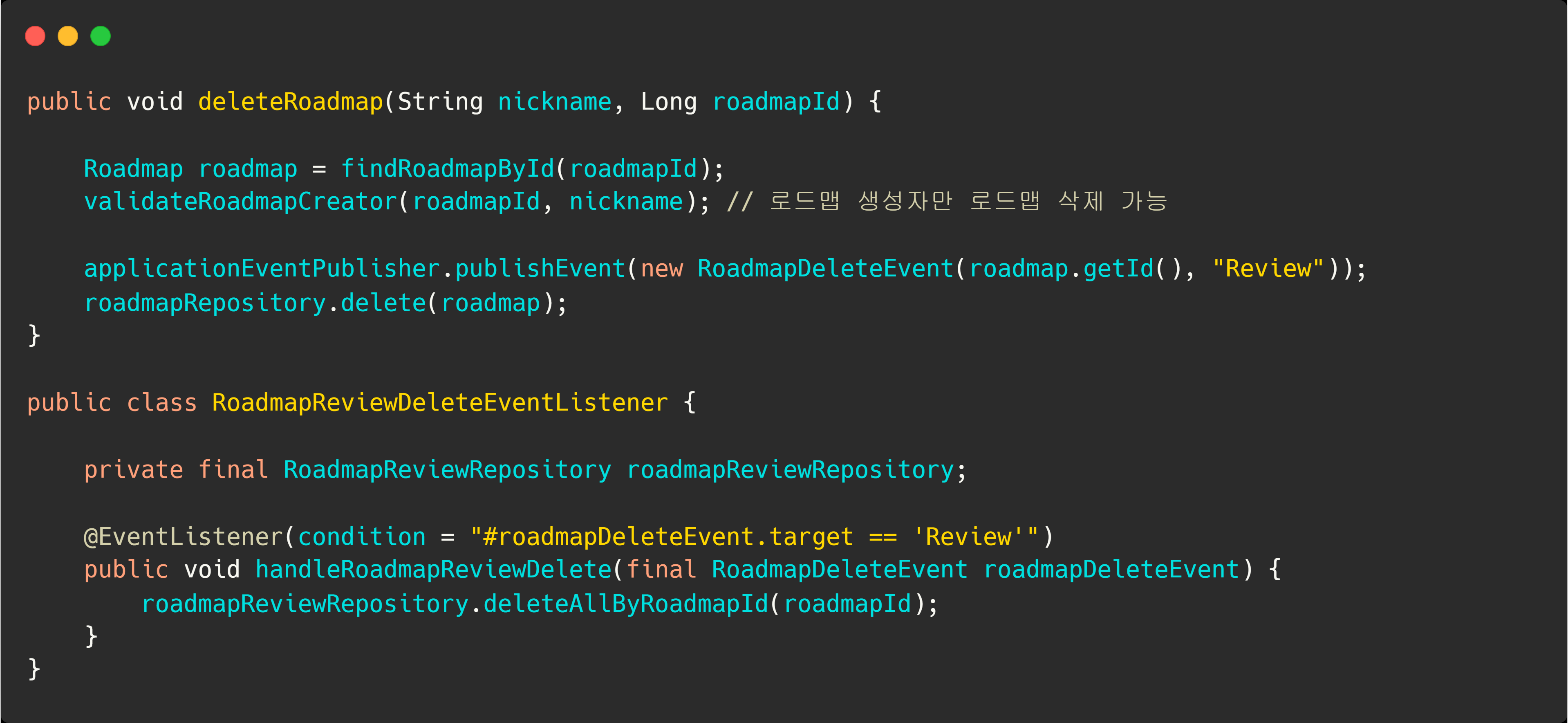 결국 delteRoadmap() 이라는 메서드는 로드맵을 삭제하는 것을 기대하는 것이고, 로드맵의 삭제에 따른 추가적인 규칙들은 얼마든지 바뀔 수 있다. 이럴 때는 '로드맵이 삭제된다'라는 의미의 이벤트를 발행해서 그에 따른 규칙들에 영향을 받는 객체들이 이벤트를 구독한 뒤 처리하도록 할 수 있다.