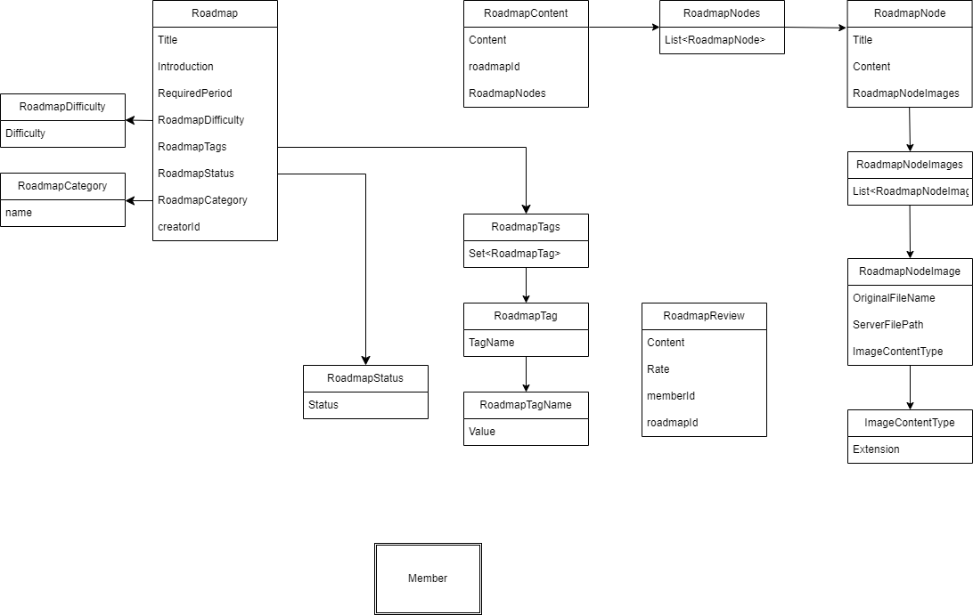 RoadmapReview와 Roadmap의 생명주기가 다르다고 판단했기 때문에 직접 참조를 끊어버리고 id를 통한 간접 참조 역시 한 방향으로만 흐르도록 바뀌었다. 그와 다르게 RoadmapContent 내부의 많은 다른 도메인들은 RoadmapContent가 생명주기가 같고 조회할 때 같이 불러오는 경우가 대부분이기에 의존성 사이클만 제거해주었다. 또한 전체적으로 도메인 내에서 Member를 직접 참조하는 경우를 없애고 서비스 레이어에서 각 클래스에 있는 memberId를 통해 조회하도록 했다.