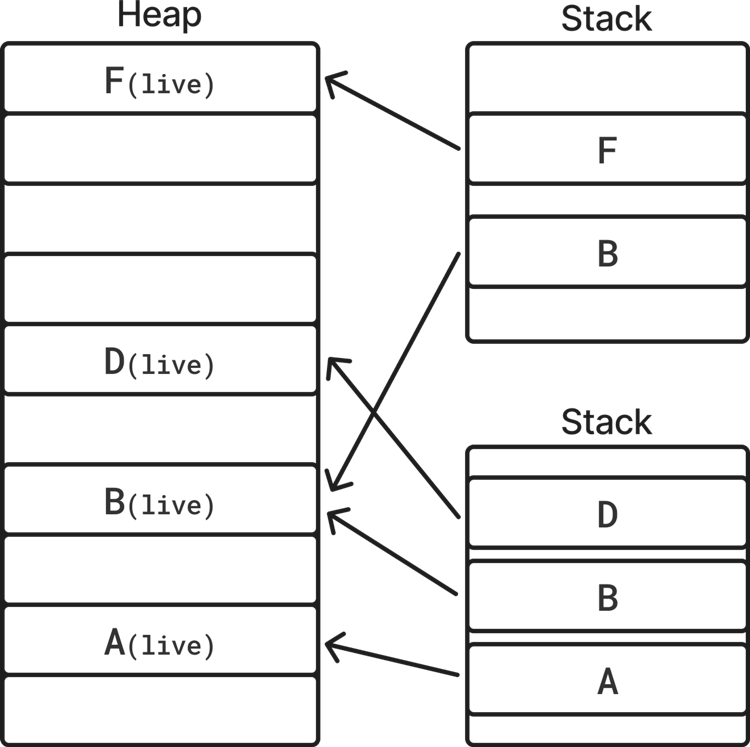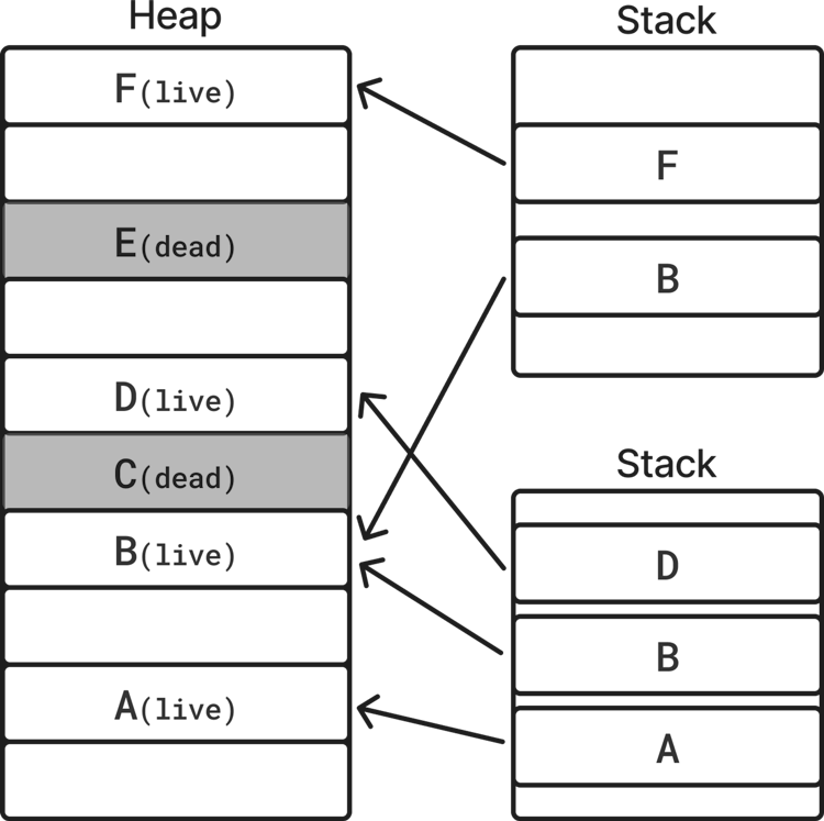 이 때 다른 객체로부터 참조되는 객체를 살아있다(live)라고 표현하며, 참조되지 않는 개체를 죽었다(dead)라고 표현한다. 그리고 이 죽은 영역을 garbage라고 하며 GC의 메모리 해제 대상이 된다.