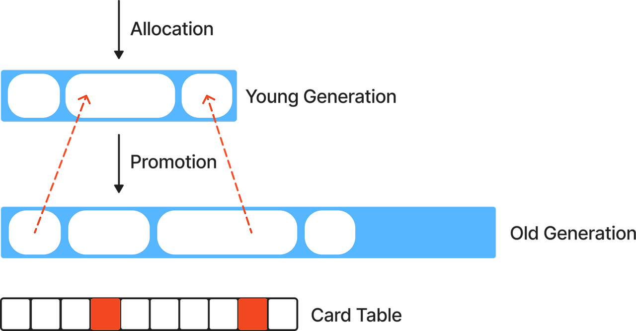 - Card Table Old Generation에서 Young Generation을 참조하는 경우는 적지만 존재할 수 있다. 그런 경우 Minor GC가 진행될 때 Old Generation의 객체들도 조회해야 하는데, generational gc의 이점이 사라지게 된다. 따라서 그런 경우는 따로 Card Table에 저장하여, Old Generation 영역을 살펴볼 필요 없이 Card Table만 조회하면 충분하도록 설계할 수 있다.
