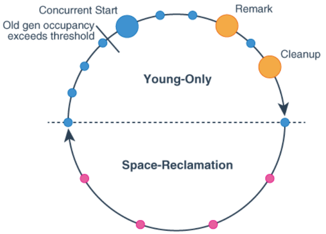 Space-Reclamation 단계 종료 후, 다시 Young-Only 단계가 시작된다. 만약을 위해, liveness 정보를 수집하는 동안 메모리가 부족할 경우, STW 상태에서 전체 힙 영역에 대한 GC(Full GC) 를 진행한다.