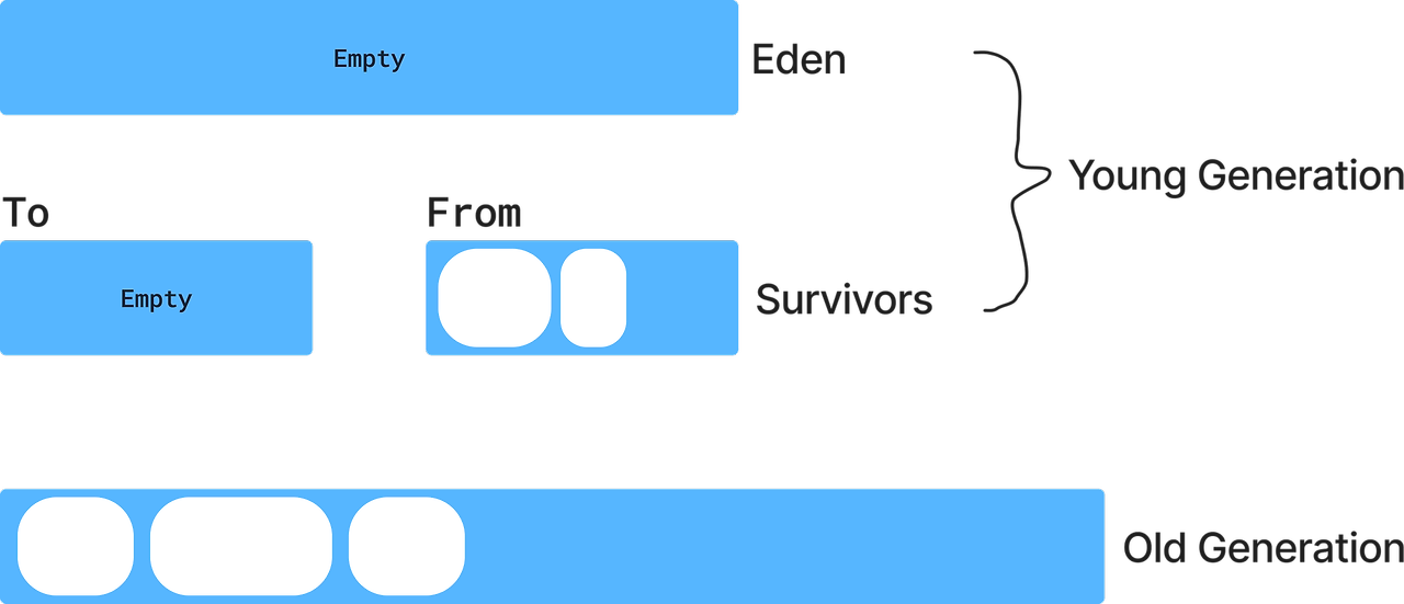 우선 Young Generation이 Eden과 2개의 작은 Survivor 영역으로 이루어져있다. 처음 객체가 생성될 때는 Eden 영역에 할당된다. Survivor 영역은 한 번 이상의 Minor GC 이후에도 살아 있는 젊은 객체들이 할당된다. 이 때 2개의 Survivor 영역 중 하나는 반드시 사용되어야 하고, 하나는 반드시 비어있어야 한다. Survivor 영역에서 충분히 오래된 객체들은 Old Generation으로 promotion된다.